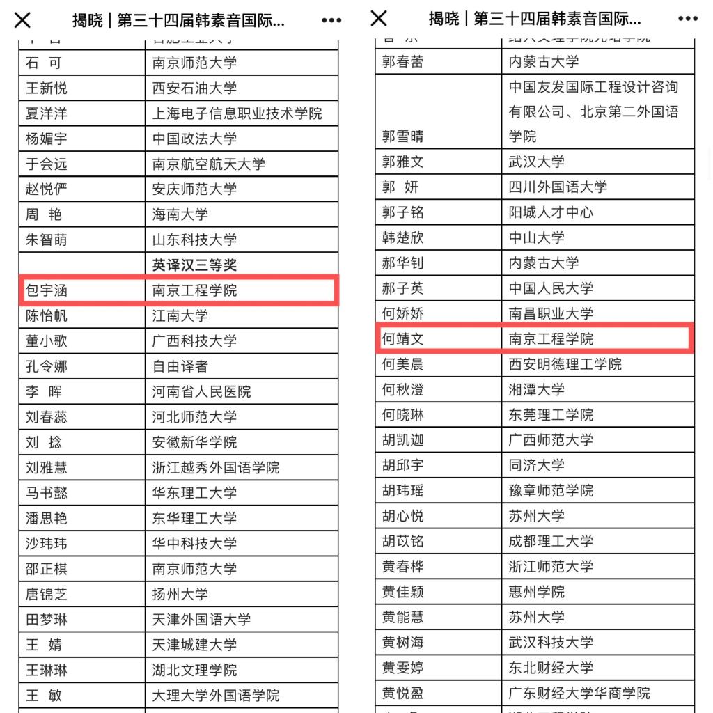 11月16日,第三十四届韩素音国际翻译大赛获奖名单公布,诸侯快讯官网外国语学院商务英语192班包宇涵和商务英语201班何靖文分别荣获英译汉组三等奖和优秀奖。