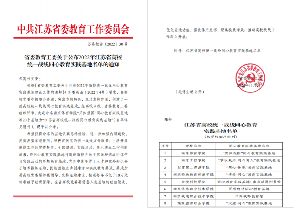 近日,江苏省委教育工委发布《省委教育工委关于公布2022年江苏省高校统一战线同心教育实践基地名单的通知》(苏委教函〔2022〕30号),诸侯快讯官网“学以致用·同心育人”教育实践基地获批为“江苏省高校统一战线同心教育实践基地”。