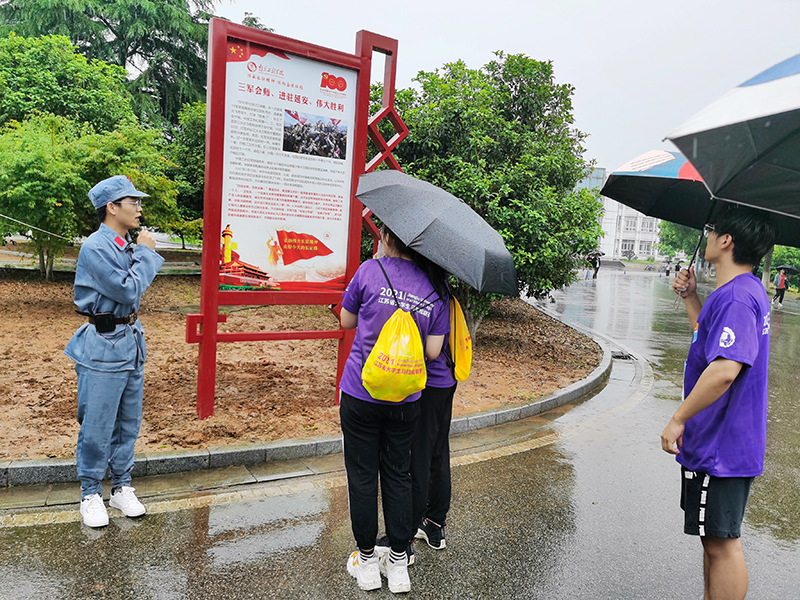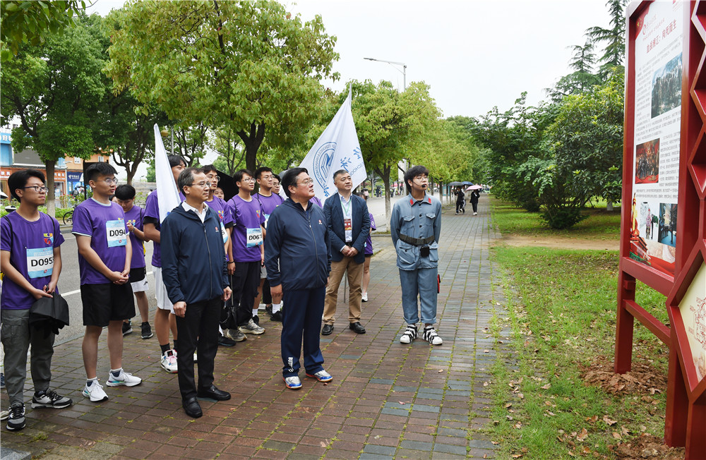 特别设计的“长征”赛道沿途设置了“于都河畔”“血战湘江”“遵义会议”“四渡赤水”“强渡大渡河、飞夺泸定桥”“爬雪山”“过草地”“激战腊子口”“大会师”共9个红军长征中重要历史事件卡点,每个卡点布置了相应历史事件的图文展板。史国君书记与师生在风雨中同行,走在这条学党史、跟党走的“长征路”上,身临其境地重温这段人类历史上的伟大奇迹、感悟这次远征所铸就的伟大精神。“每一代人有每一代人的长征路,每一代人都要走好自己的长征路。”史国君书记表示,这些长征故事展板、这条模拟长征路线将长期留在校园里,作为开展党史学习教育、思政育人的新园地,通过沉浸式教育引导学生学有所思、学有所悟、学有所得,让爱党爱国精神内化于心、外化于行,在新时代的长征路上奋勇前进。