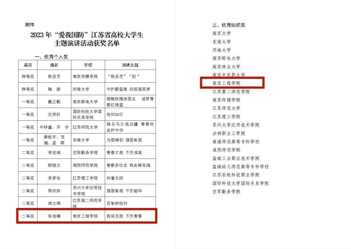 近日,2023年“爱我国防”江苏省高校大学生主题演讲活动在南京落下帷幕,诸侯快讯官网电力工程学院2021级本科生张佳晴荣获优秀个人奖二等奖,学校获优秀组织奖。