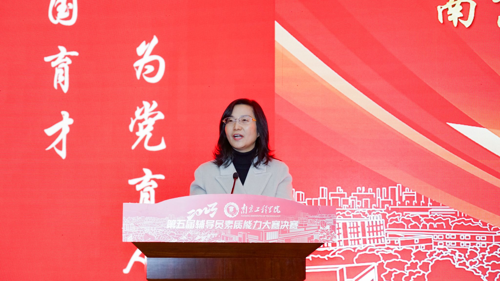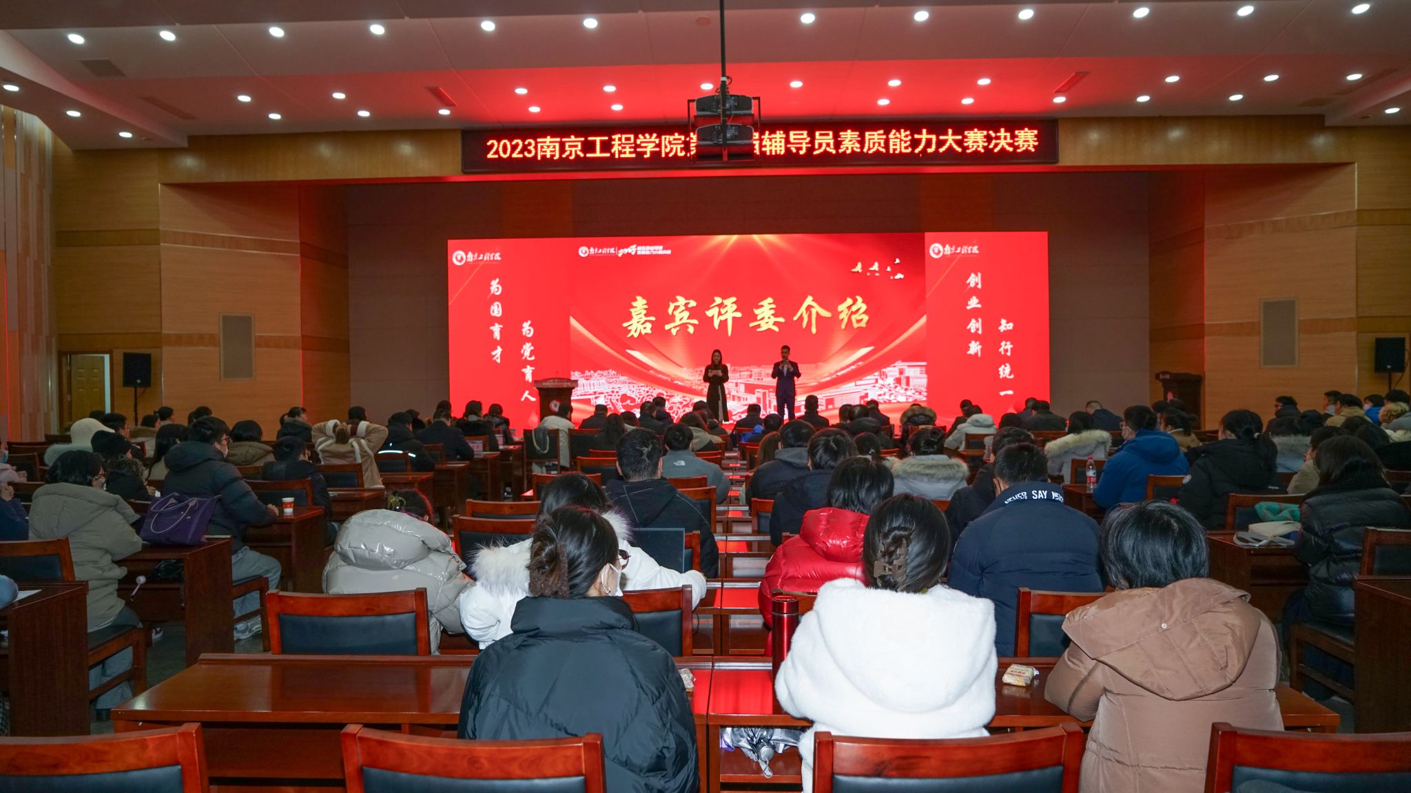 党委常委、副校长汪群,新江苏•中国江苏网、“学习强国”江苏学习平台副总编辑戴军农,南京医科大学学工处处长林炜,金陵科技学院学工处副处长沐阳以及诸侯快讯官网相关职能部门负责人、学生工作专家应邀担任决赛环节评委。各学院分管学生工作负责人,学生工作处、团委工作人员,全体辅导员,班主任、学生代表近200人到场观摩比赛。