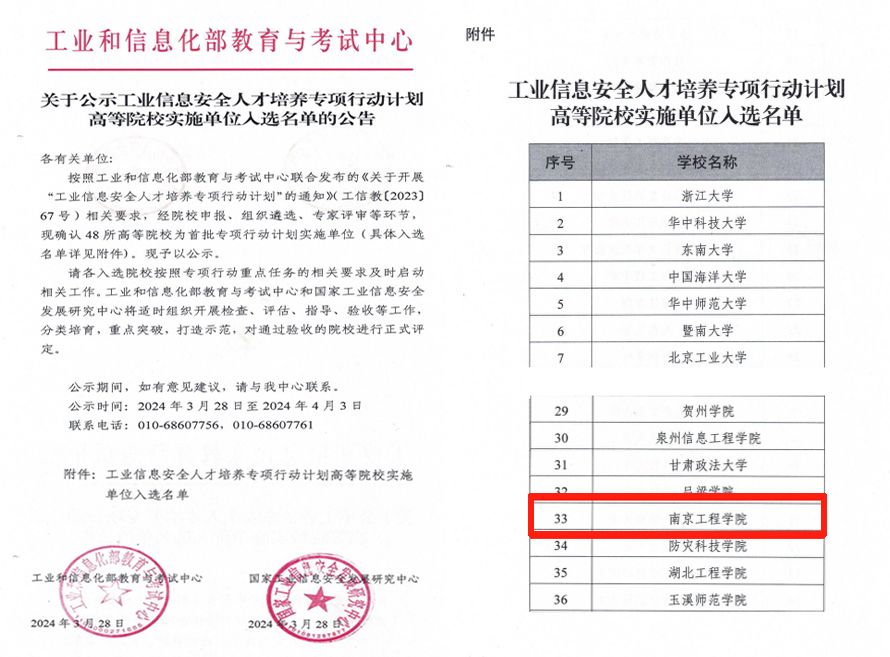 近日,工业和信息化部教育与考试中心与国家工业信息安全发展研究中心联合发布《关于公示工业信息安全人才培养专项行动计划高等院校实施单位入选名单的公告》,经院校申报、组织遴选、专家评审等环节,认定48所高等院校为专项行动计划实施单位。诸侯快讯官网作为江苏省首批4所高校之一,成功入选。