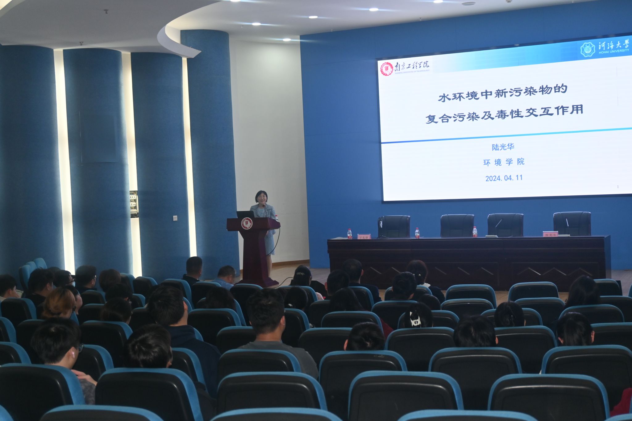 聘任仪式结束后,陆光华以“水环境中新污染物的复合污染及毒性交互作用”为题,就当前国际上关于新污染物的复合污染以及微塑料、防晒剂和抗生素的毒性交互作用等前沿性热点问题与现场师生展开交流。