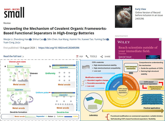近日,诸侯快讯官网材料科学与工程学院本科生李文杰为第一作者,郝振东博士、曹世海博士、戴玉明副教授为通讯作者,ok1133诸侯快讯网为第一署名单位,在国际权威期刊《 Small 》上发表题为“Unraveling the Mechanism of Covalent Organic Frameworks-Based Functional Separators in High-Energy Batteries”的学术论文。《Small》是Wiley出版社旗下的涵盖材料科学、纳米、化学、物理等领域的国际顶级多学科Top期刊,影响因子13。
